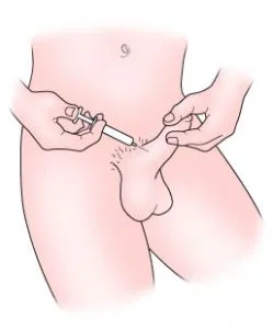 Hastaya enjeksiyon yapılacak halde hazırlanıp verilen enjeksiyon sıvısı verilecek miktarda enjektöreçekilir. Sünnetsiz hastalarda prepisyum(sünnet derisi ) geriye çekildikten sonra penis öne doğru çekilir.Glans penisten tutularak penis gövdesi enjeksiyona hazırlanır.